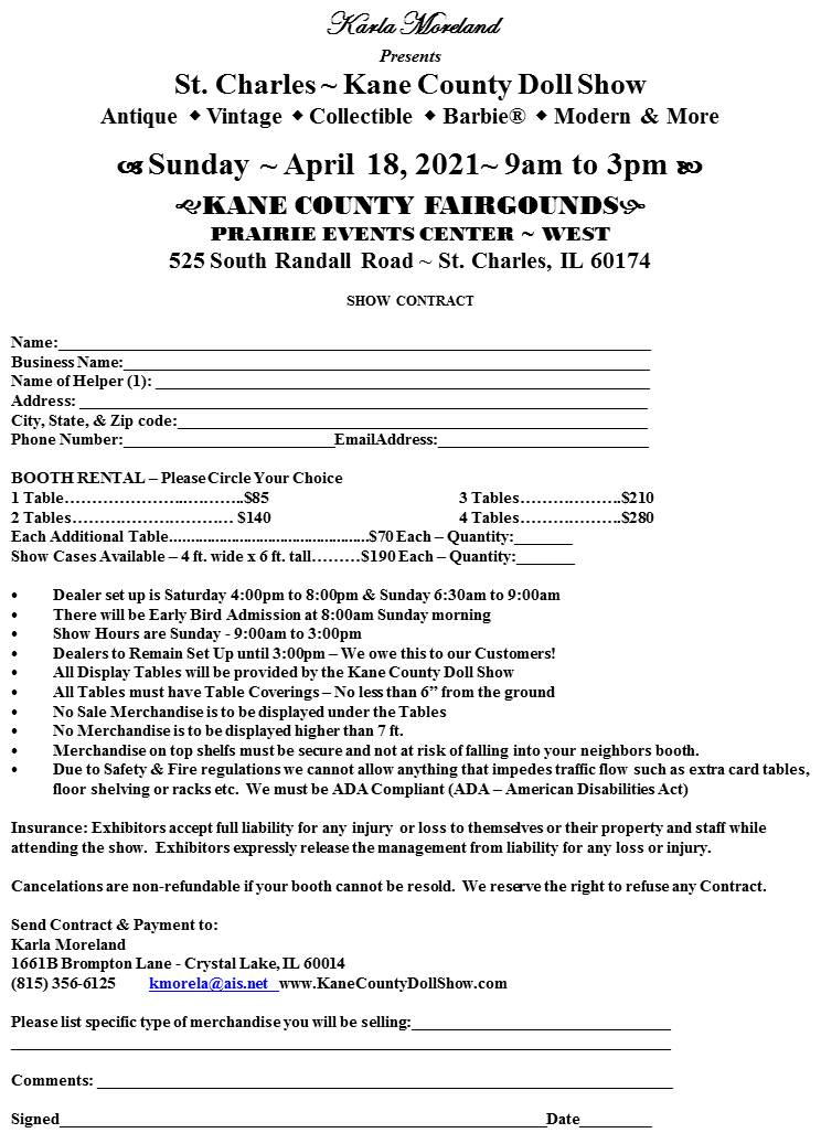 Karla Moreland KANE COUNTY DOLL SHOW NAPERVILLE DOLL SHOW Crystal Lake, IL ph: 815-621-3255 kmorela@ais.net